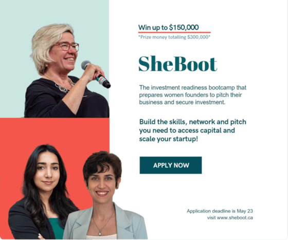 Fifteen Canadian women-led startups are selected to join SheBoot each year. They complete bootcamp in the fall to become investment-ready, then pitch for the grand prize of a minimum of $150,000 in investment, with the prize money awarded totalling $300,000 in equity-based funding. |